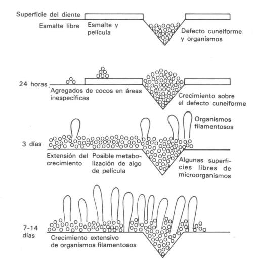 bacteriana en las superficies oclusales, espacios interproximales y los cuellos dentarios. Si la placa