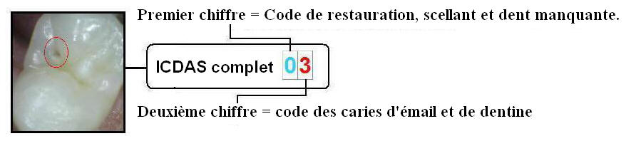 | Dans ce cas, le premier chiffre 0 identifie la surface de la dent comme "non restaurée ou scellée"; le deuxième chiffre dans ce cas 3 identifie la surface de la dent en tant que carie de l'émail et de la dentine: "Perte de l'intégrité de l'émail <0,5 mm., dentine non visible". Le codage est effectué par unité de surface, les limites de la surface de la dent doivent être connues; pour que l'enregistrement de l'extension de la carie soit standardisé. |