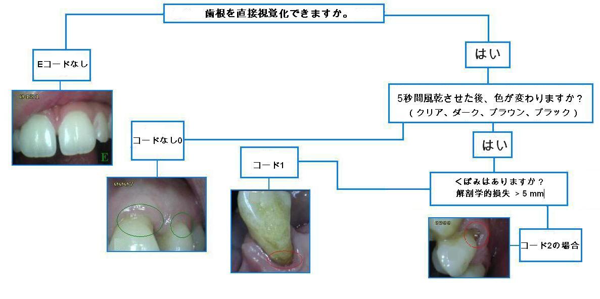 歯肉の後退の結果として、または穏やかな風乾によって、根の表面を直接可視化することができない場合、それは除外される。結石によって完全に覆われた表面は除外することができ、または好ましくは、結石は表面の状態を決定する前に除去することができる。結石の除去は、臨床試験および縦断的研究に推奨されます。 |