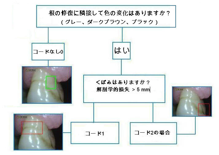根の表面が一杯になり修復物に隣接してう蝕がある場合、その表面はう蝕として記録される。歯根の修復に関連するう蝕の基準は、修復されていない歯根表面のう蝕の基準と同じです。次の図(図2)は、根面の修復物に隣接する虫歯の適切なコーディングを決定する際に、試験官を支援します。