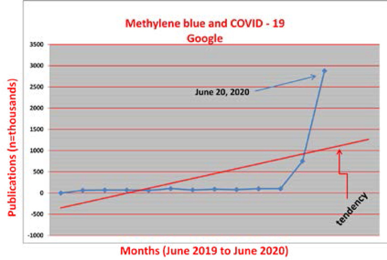 Evolución del número total de citas recopiladas como resultado de una consulta genérica (azul de metileno y COVID-19) (Google). En ese momento, dos citas filosóficas me motivaron a reescribir la carta rechazada: “La medicina es la ciencia de la incertidumbre y el arte de la probabilidad” (William Osler) y “Nada te pertenece más que tus sueños” (Friedrich Nietzsche). Decidí volver a enviar la carta ahora, considerando que COVID-19 debería ser un “promotor” de azul de metileno, y el tinte puede obtener el estatus de salvamento que se merece. REFERENCIAS 1. Eickmann M, Gravemann U, Handke W, Tolksdorf F, Reichenberg S, Müller TH, et al. Inactivación de tres virus emergentes - coronavirus del síndrome respiratorio agudo severo, virus de la fiebre hemorrágica de Crimea-Congo y virus de Nipah - en concentrados de plaquetas por luz ultravioleta C y en plasma por azul de metileno más luz visible. Vox Sang. 2020; 115 (3): 146-151. doi: 10.1111 / vox.12888. [ Artículo gratuito de PMC ] [ PubMed ] [ CrossRef ] [ Google Scholar ] 2. Stramer SL, Hollinger FB, Katz LM, Kleinman S, Metzel PS, Gregory KR, et al. Agentes de enfermedades infecciosas emergentes y su potencial amenaza para la seguridad de las transfusiones. Transfusión. 2009; 49 (Supl. 2): 1S – 29S. doi: 10.1111 / j.1537-2995.2009.02279.x. [ PubMed ] [ CrossRef ] [ Google Scholar ] 3. Stramer SL. Perspectivas actuales en enfermedades infecciosas transmitidas por transfusiones: infecciones emergentes y reemergentes. ISBT Sci Ser. 2014; 9 (1): 30–36. doi: 10.1111 / voxs.12070. [ Artículo gratuito de PMC ] [ PubMed ] [ CrossRef ] [ Google Scholar ] 4. Evora PR, Alves Junior L, Ferreira CA, Menardi AC, Bassetto S, Rodrigues AJ, et al. Veinte años de tratamiento del síndrome vasopléjico en cirugía cardíaca. Azul de metileno revisado. Rev Bras Cir Cardiovasc. 2015; 30 (1): 84–92. doi: 10.5935 / 1678-9741.20140115. [ Artículo gratuito de PMC ] [ PubMed ] [ CrossRef ] [ Google Scholar ] Metahemoglobinemia inexplicable en la enfermedad por coronavirus 2019: informe de un caso Los artículos de la Revista Brasileña de Cirugía Cardiovascular se proporcionan aquí por cortesía de Sociedade Brasileira de Cirurgia Cardiovascular AA Pract . 2020 julio; 14 (9): e01287. Publicado en línea el 16 de julio de 2020. Doi: 10.1213 / XAA.0000000000001287 PMCID: PMC7373357 PMID: 32909713