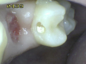 Vista desde vestibular donde se observa la caries mesial y