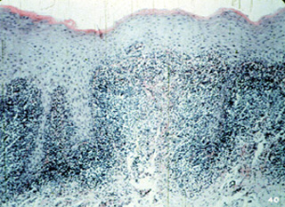 plano erosivo, sin embargo, la degeneración de la basal procede a un punto dónde el epitelio se separa del tejido conjuntivo subyacente. Note en esta vista a