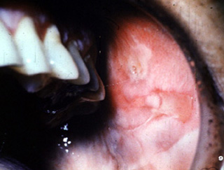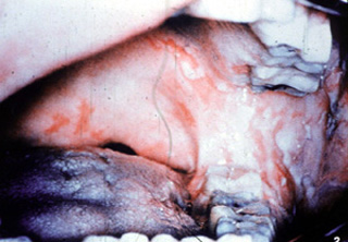 Note las numerosas áreas ulceradas en el paladar duro