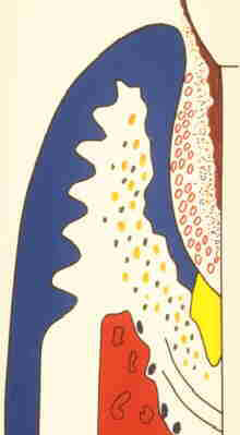 El resultado de un proceso inflamatorio produce la hinchazón de la gingiva. Como consecuencia los tejidos gingivales se entallan a las paredes de los dientes o a cualquier otra materia sólida en la vecindad. El desagüe de células inflamatorias y detritos de la bolsa periodontal lleva a la disminución de la concentración de substancias inflamatorias en la bolsa periodontal. El edema comienza un círculo vicioso. La reactividad vascular se aumenta y el plasma entra en los espacios extravascular. Los mediadores de la fase temprana para la resorción del hueso y proliferación del epiltelio que sueltan los leucocitos y las reacciones inmunes que también son aceleradas en el tejido conjuntivo. El aviso temprano al paciente en esta fase es el dolor y sangrado durante el cepillado. Si el desagüe se restablece a través de la bolsa periodontal la reacción disminuye. A veces esta recaída ocurre sin tratamiento pero a menudo la lesión sigue su curso de eventos que llevan a la destrucción del tejido. Los sitios profundos al sondaje son ideales para el desarrollo del absceso periodontal. Pacientes que de repente empiezan a limpiar sus dientes intensivamente pueden inducir a sanar el margen coronal, este se adherirá y evitará el desagüe normal del espacio subgingival. También pacientes que empiezan a controlar quimicamente la placa, como por ejemplo con el uso de clorhexidine, también pueden desarrollar abscesos periodontales. Volver a página