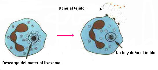 Siguiendo la ingestión del microorganismo, el leucocito neutrófilo descarga substancias antibacterianas y enzimas en el vacuola lisosomal dónde las bacterias residen. En este proceso el neutrófilo no diferencia entre su membrana interna y el fagosoma que lleva a que una porción del material lisosomal también se suelta en el ambiente. La concentración alta de substancias fuera de las células contribuye a la defensa total de la región pero en el mismo momento estas sustancias también dañan al huesped. Los inhibidores del organizador están disponibles pero en el proceso bioquímico activo estos compuestos para controlar la reacción se consumen produciendo un efecto dañoso para el huésped. Volver a página anterior |