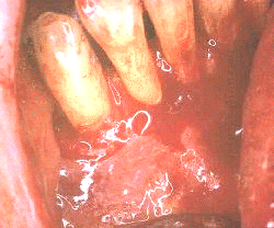 Mujer de 64 años de edad con  enfermedad periodontal severa en los dientes anteroinferiores. Al sondaje de la bolsa periodontal presentó una profundidad de  5-8 mm. En el  examen inicial al sondaje suave  presentó  flujo de pus en el margen gingival. La imagen ilustra un síntoma prominente de la enfermedad periodontal severa.