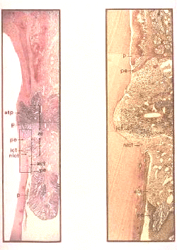 Sección buco-lingual del periodonto en un diente molar de un perro con enfermedad periodontal naturalmente ocurriendo. El epitelio de unión se localiza hacia el cemento de la raíz. La terminación apical  del epitelio de unión desaparece exponiendo el tejido conjuntivo. La razón para esta variante de destrucción periodontal es la ocurrencia de las áreas vecinas de infección subgingival.