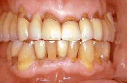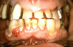 Varón de  63 años de edad con  enfermedad periodontal severa. Los dientes se han desgatado severamente y al sondaje de las bolsas periodontales encontramos una profundidad de  6-8 mm. En el canino inferiór puede observarse un épulis. Las señales de inflamación severa están presentes. La condición necesita tratamiento quirúrgico  con  gingivectomía, raspaje y alisado radicular. El paciente es instruído en los procedimientos de higiene oral.