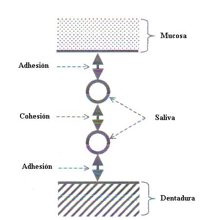 la presencia de una delgado film continuo de saliva entre la prótesis y la