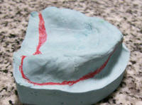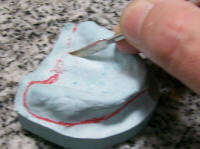 Se debe desgastar 0,5 milímetros de profundidad. Para compensar la contracción del acrílico durante la etapa de curado. Límite pospalatal y grado de profundidad del desgate del modelo de la prótesis superior Se utiliza plastilina para eliminar las retenciones Se observan las sombras en el modelo, que indican las zonas retentivas