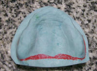 Recorte de la lámina de acrílico más allá del diseño de la cubeta Cubeta ya recortada. Se utiliza acrílico de auto curado transparente para darle fortaleza. Se agrega a una parte del monómero y 2 partes de polímero, y se mezcla en forma suave para no incorporar burbujas a la mezcla.