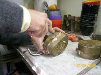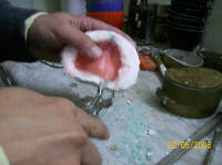 • Se realiza el vaciado. El yeso no debe interferir en el cierre de la mufla, por ello el borde de bronce debe estar limpio de yeso