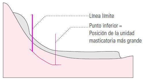 Detrás de la línea límite empieza la parte de la rama mandibular que sube de forma pronunciada. Aquí ya no debe montarse ningún diente ya que produciría el deslizamiento de la prótesis hacia delante debido a la carga incorrecta. En el caso de crestas alveolares poco empinadas, el montaje de los dientes termina en el borde mesial de los trígonos retromolares