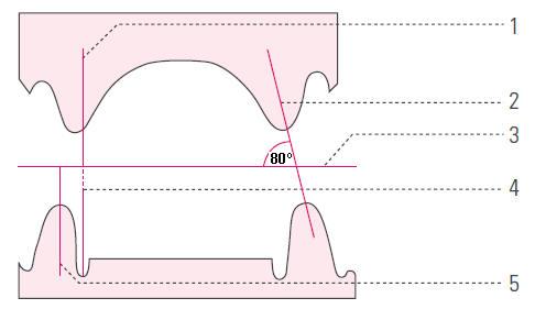 Si la inclinación de la línea inter-alveolar con respecto al plano oclusal (4) es superior a 80°, se montará una mordida normal; si es inferior a 80°, debe montarse una mordida cruzada. (Gysi) para mejorar la estabilidad de la prótesis y dar espacio a la lengua.