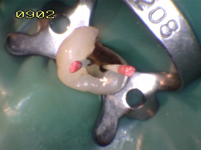 Dos conductos bien delimitados, ensanchados con limas rotatorias, recidiva de caries en distal. |