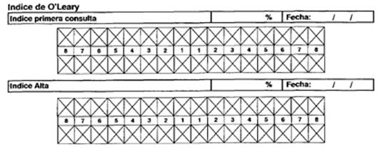 Hemos incluido el índice de O`Leary para la enseñanza de cepillado y cuantificación de la placa bacteriana. Indica el porcentaje de superficies teñidas (color rosa oscuro, si se emplea eritrosina; rosa y azul, si usa doble tono) sobre el total de superficies dentarias presentes.